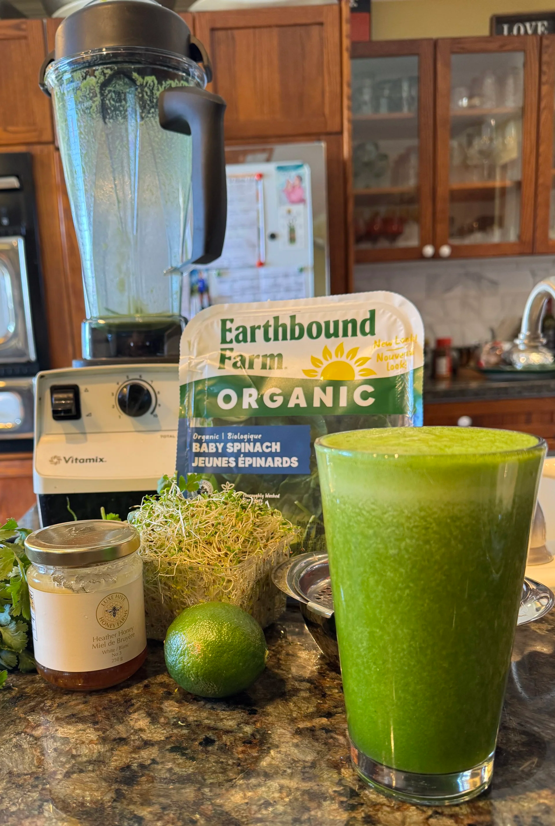 Add a generous handful of organic, washed spinach or other greens. (I like to rotate my greens, and fresh broccoli sprouts are one of my favourites)